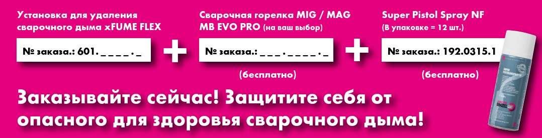 При покупке компактной установки для удаления сварочного дыма хFUME FLEX вы получите сварочную горелку MIG/MAG серии MB EVO PRO* и двенадцать баллончиков Super Pistol Sprey NF, бесплатно!